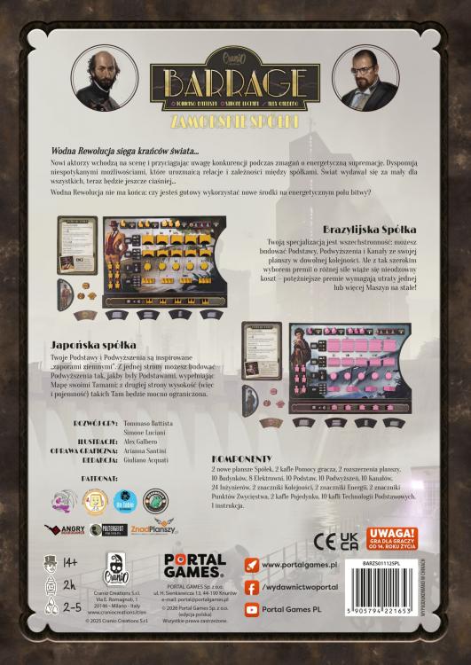 Nowi aktorzy wchodzą na scenę walki o energetyczną supremację. Dysponują niespotykanymi możliwościami, które urozmaicają relacje i zależności między spółkami. Świat wydawał się za mały dla wszystkich. Teraz będzie jeszcze ciaśniej! Odkryj kolejne rozszerzenie do Barrage – zaawansowanej ekonomicznej gry planszowej autorstwa Simone Luciani, w której gracze zarządzają spółkami walczącymi o prymat na rynku produkcji energii elektrycznej w regionie Alp.