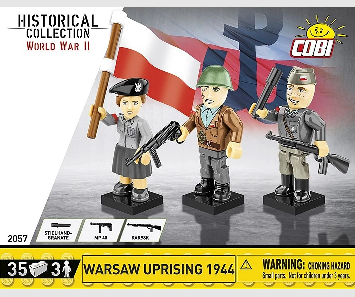 Zestaw trzech figurek przedstawiaj±cy powstańców warszawskich z 1944 roku. Po¶ród figurek znajdziemy ł±czniczkę z polsk± flag± oraz żołnierzy Armii Krajowej w improwizowanych mundurach, których cech± charakterystyczn± były biało-czerwone opaski na rękawach i polskie symbole na furażerkach i zdobycznych hełmach. Wszystkie figurki zawieraj± zupełnie nowe, bardzo atrakcyjne nadruki umundurowania i twarzy oraz podstawki do łatwiejszego eksponowania. Do każdej figurki doł±czone s± akcesoria takie jak pistolet maszynowy MP 40, granat trzonkowy czy karabin Mauser.