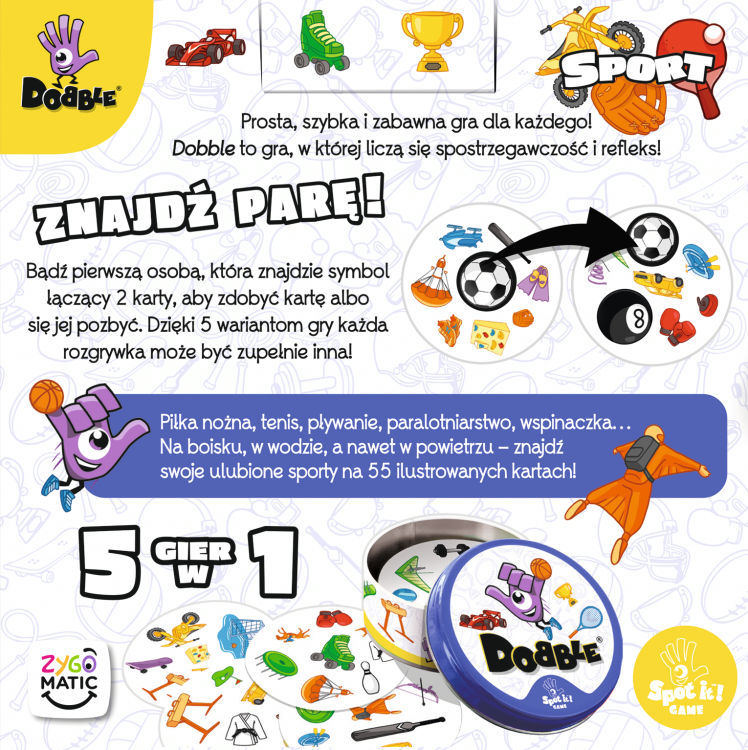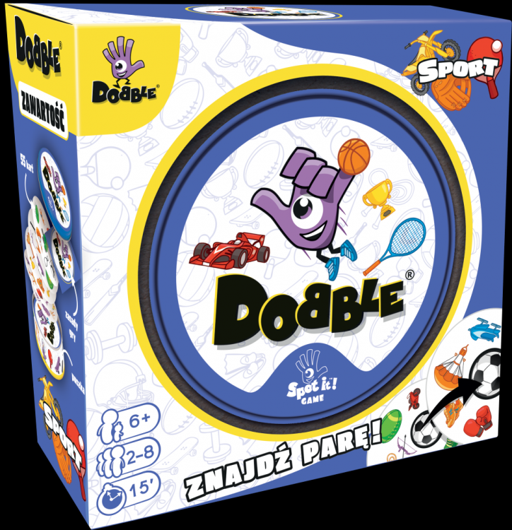 Dobble Sport to nowa odsłona popularnej gry karcianej, w które staramy się znajdować pary identycznych symboli zanim zrobią to przeciwnicy. Zestaw zawiera 55 kart z przedmiotami charakterystycznymi dla różnych dyscyplin sportowych. Jednak gra wiąże się z aktywnością nie tylko z nazwy! Dzięki angażującym mechanizmom opartym o refleks i zręczność, Dobble świetnie wspierają trening spostrzegawczości i szybkości reakcji.