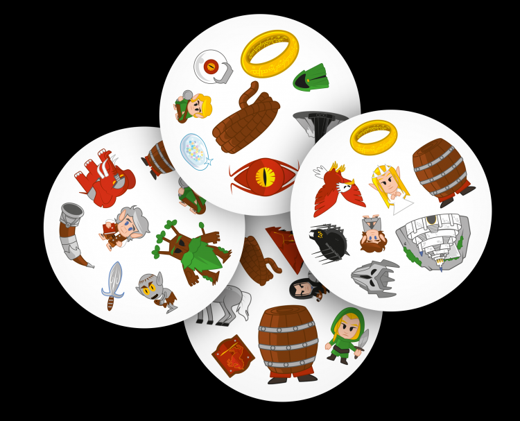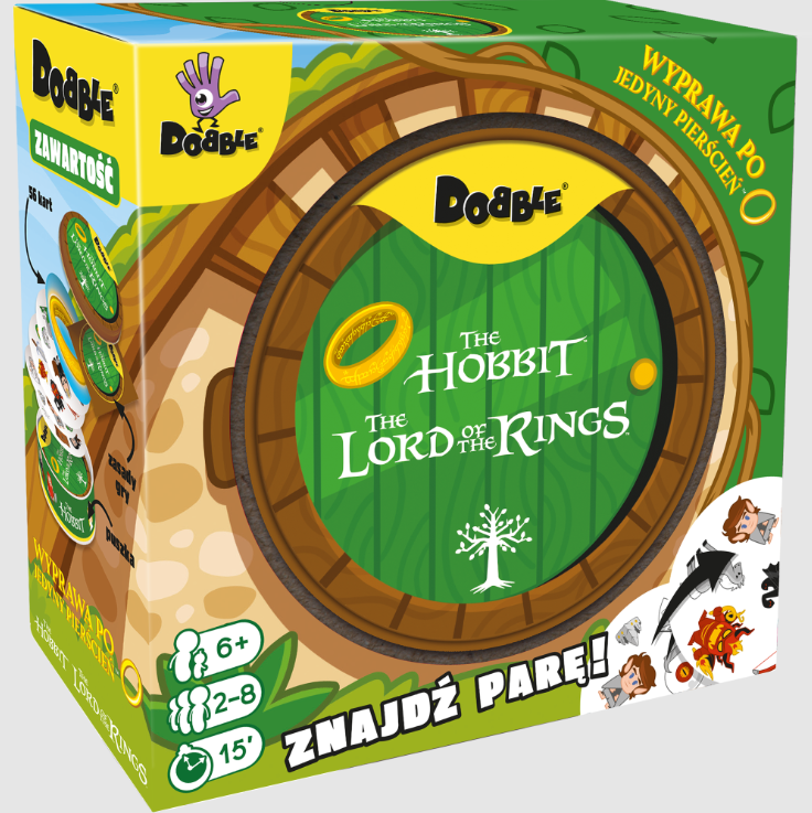 Zabierz Froda, Sama, Gandalfa oraz Smauga gdzie tylko zechcesz i baw się, szukając par w popularnej grze towarzyskiej! Spójrz na pierwszą kartę, którą trzymasz w ręku oraz na tę, która leży na środku stołu. Znajdź na nich wspólny symbol, nazwij go i szybko pozbądź się swojej karty. Teraz następna! Tylko nie zwątp, dwie karty zawsze łączy dokładnie jeden wspólny obrazek!