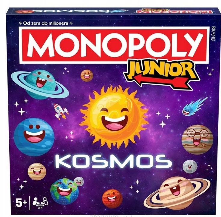 Witamy w Kosmosie! W tej wersji Monopoly Junior czeka na Ciebie niesamowita przygoda! Rakiety, planety i stacje kosmiczne już nie mogą się doczekać, aż je odwiedzisz. Wsiadaj na pokład swojej rakiety i leć badać odległe galaktyki oraz odkrywać tajemnice kosmosu. Pamiętaj, żeby zatankować swoją rakietę na stacji orbitalnej kosmiczne podróże wymagają dużo paliwa! Uważaj na burze kosmiczne, które mogą pokrzyżować Twoje plany. O nie! Twoja rakieta się zepsuła? Spokojnie, pomocni astronauci i ich dzielne roboty na pewno wszystko naprawią.