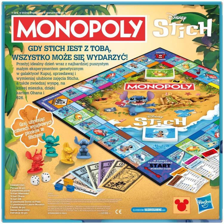 Monopoly: Stich to strategiczna gra planszowa dla całej rodziny, w której klasyczne pola nieruchomości zastąpiono aktywnościami takimi jak pokaz pływanie na desce, relaks oraz czy spotkanie przy herbacie. Podczas zabawy wybieramy jeden z unikalnych pionków Sticha, a następnie rozpoczynamy poruszanie się po planszy, starając się jak najwięcej zarobić na wynajmie domków plażowych. Od tego zależy, jak atrakcyjny będzie nasz dzień spędzony ze Stichem - i jak wysoki czynsz będziemy mogli pobrać od innych graczy!