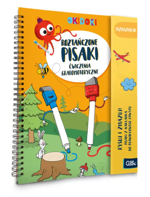 „Roztańczone Pisaki” to seria kreatywnych zeszytów z ćwiczeniami grafomotorycznymi, stworzonych specjalnie dla dzieci w wieku przedszkolnym i wczesnoszkolnym. Dwaj sympatyczni bohaterowie – kolorowe pisaki Rubinek i Szafirek, w rymowanych opowieściach zachęcają dziecko do rysowania, ćwiczeń i zabawy.