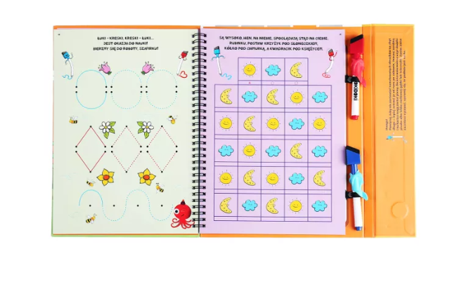 W zestawie: 50 stron z zadaniami (spiętych spiralą), 2 pisaki zmazywalne z gąbką nakładkami do prawidłowego chwytu.