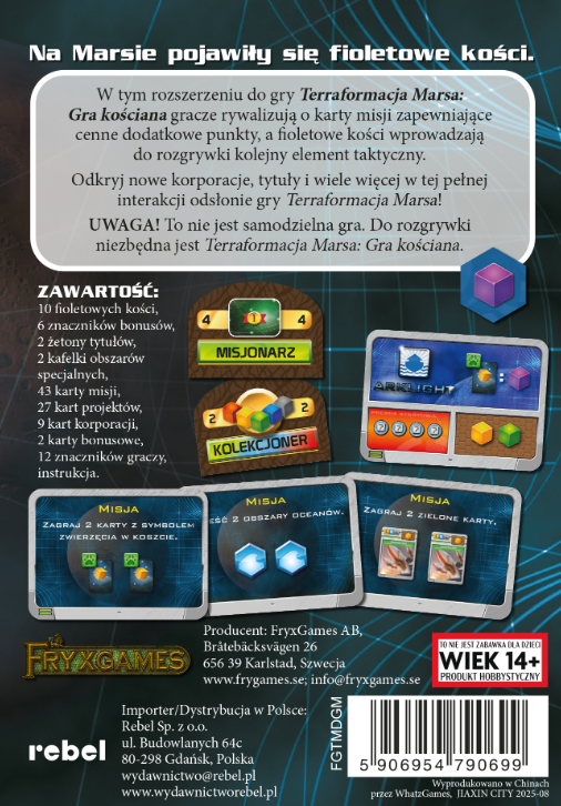 Oprócz mechaniki misji, rozszerzenie wprowadza też nowe tytuły, projekty i korporacje, a także fioletowe kości, które reprezentują wpływy graczy i mogą zapewnić im bonusy w postaci kart, znaczników uniwersalnych oraz punktów. Dzięki nim rozgrywki będą jeszcze bardziej taktyczne!