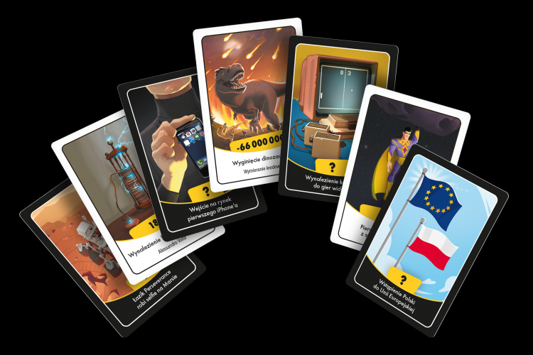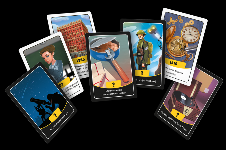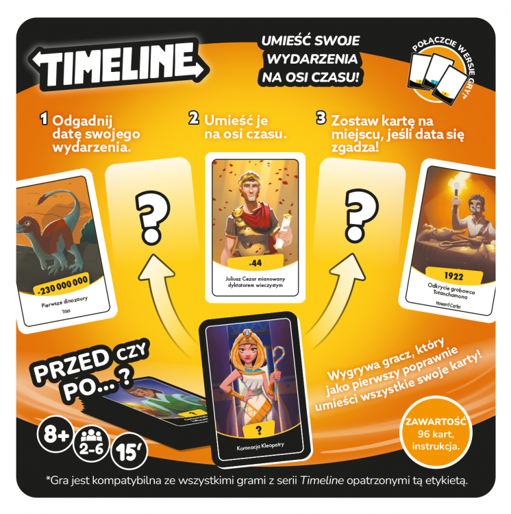 Jak sądzisz, co zostało wynalezione najwcześniej: szczoteczka do zębów, zegarek, a może teleskop? Który z cudów świata starożytnego zaczął być budowany najpóźniej? Czy ołówek we współczesnej formie jest z nami dłużej niż zapałki? Na te i inne pytania odpowie Timeline – niezwykle przyjemna karcianka dla całej rodziny, w której wspólnie tworzymy oś czasu z wylosowanych kart wydarzeń. W pudełku znajdziesz 96 kart z historii ogólnej, od prehistorii aż po współczesność.