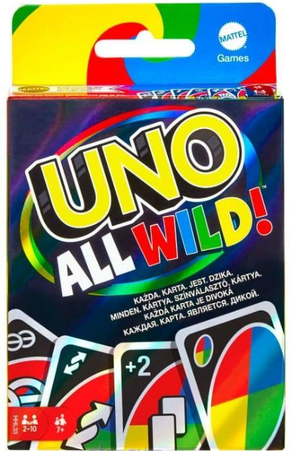 W grze UNO All Wild Dzikie karty każda karta jest dzika, co sprawia, że ta wersja jednej z ulubionych gier rodzinnych jest szybka i jeszcze bardziej nieprzewidywalna! Nie musisz dopasowywać numerów lub kolorów jak w zwykłym UNO, ale nie jest tak łatwo, jak to brzmi.