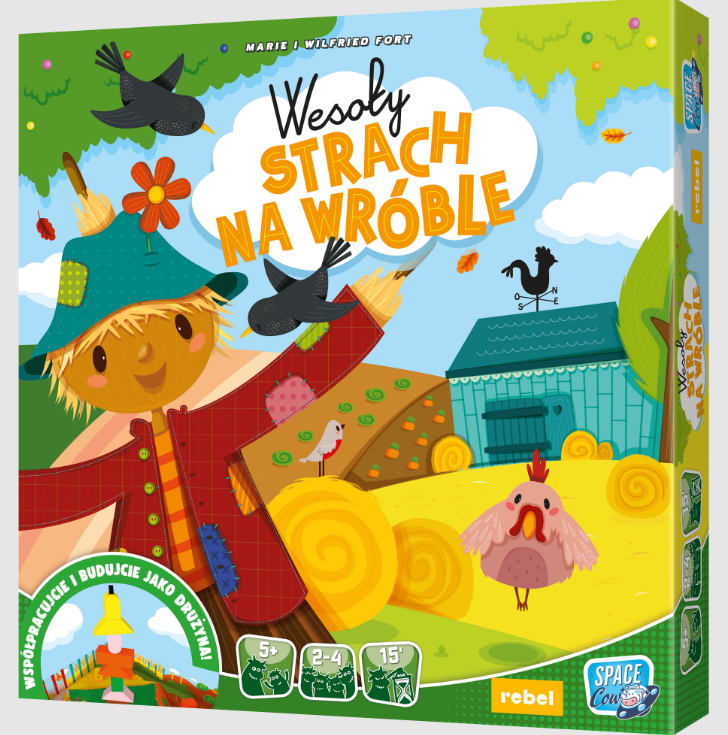 Wesoły strach na wróble to oparta na współpracy gra dla dzieci, w której staramy się odbudować tytułowego strażnika pola. Aby tego dokonać, musimy zebrać niezbędne elementy: buty, spodnie, tułów, głowę oraz kapelusz. A to wszystko zanim na płocie rozgości się 6 wron!