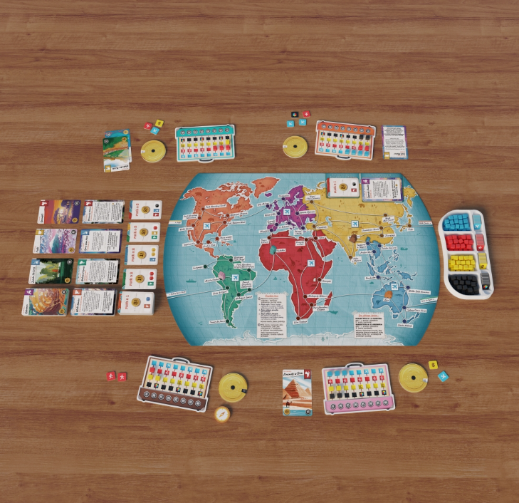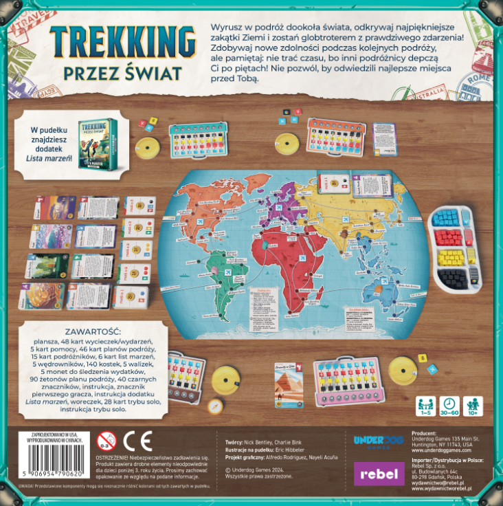 Trekking przez świat to rodzinna gra planszowa, w której wyruszamy w niesamowite podróże, by odwiedzać fantastyczne miejsca i poznawać wspaniałych ludzi z każdego zakątka globu. W każdej turze będziemy przemieszczali się po mapie, gromadząc pamiątki i biorąc udział w rozmaitych wydarzeniach, które zapewnią nam cenne punkty zwycięstwa.